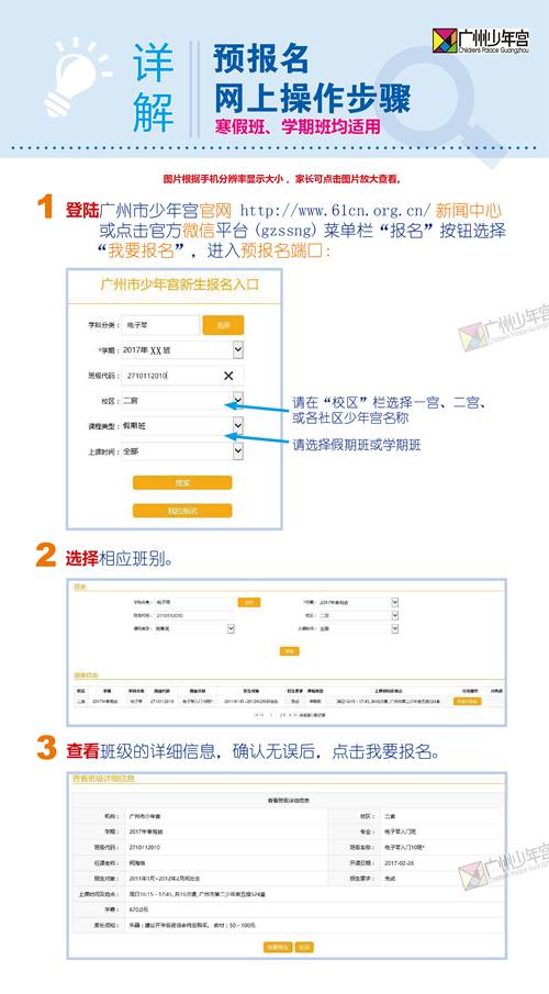 ●关注广州市少年宫官方微信(微信服务号:gzssng ),在手机上直接预报名;