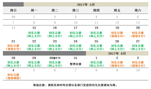 因端午节停课一周,故旧生注册现场支付和调班时间仅为两周,为避免现场缴费的长时间排队等候,强烈建议各位家长采用网上支付方式(除了需要调班、系统提示必须在现场注册的班级外)进行注册。现场注册须凭旧生注册通知和校园卡办理;本学期除银联卡刷卡外,还新增支付宝和微信支付方式,为提高工作效率,现场注册时请提前告知工作人员采取哪种方式进行支付。