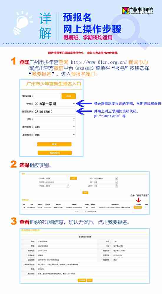 广州市少年宫2018年寒假班和第一学期学期班采取身份证“实名制”预报名,抽签确定学位的方式进行, 寒假班可接受每个学员最多8门课程的申请,学期班可接受每个学员最多16门课程的申请,家长请根据孩子的兴趣爱好合理安排课程申报顺序。