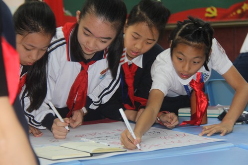 活动以宣传十九大报告精神为主,结合传达习总书记在两会上对广东“四个走在前列”的希翼和重托,以世界咖啡屋的形式,引导少理事和学校的队干们集思广益共同策划如何面向广大少先队员宣讲十九大精神。大家围绕“十九大的意义你我学”、“十九大的宣讲你我谈”和“十九大的宣讲方式多”这几个主题进行讨论,制作思维导图,将“十九大精神”与自己身处广东这片改革前沿实际情况相结合纷纷谈了感想和体会。