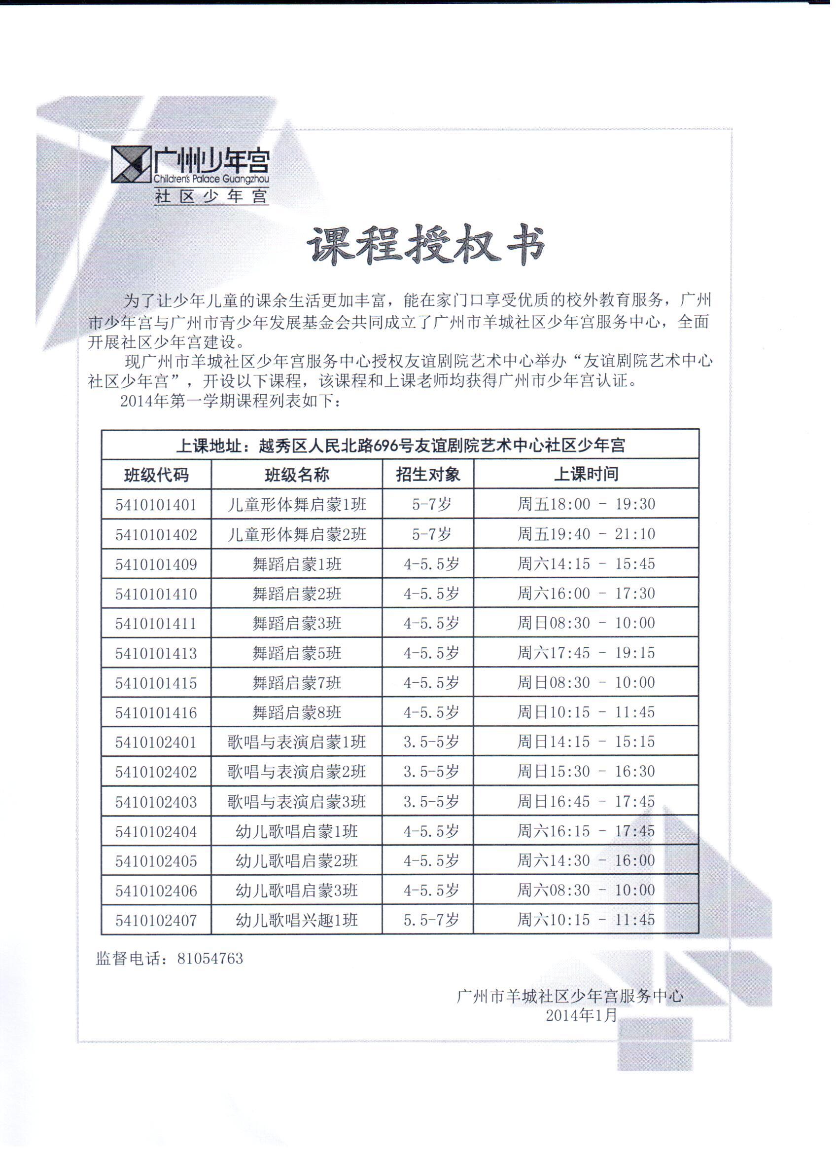 2014年友谊剧院艺术中心社区少年宫课程授权书