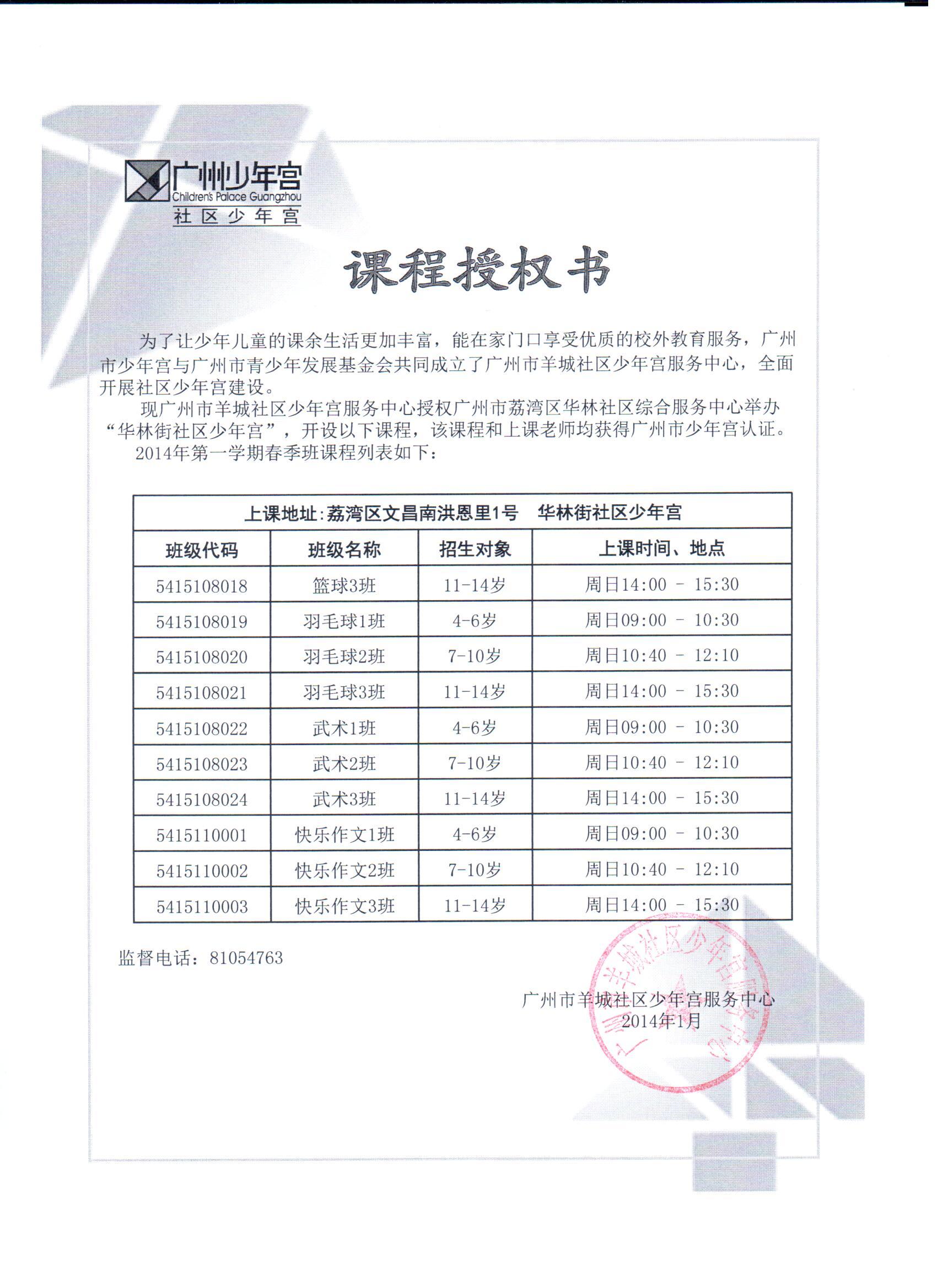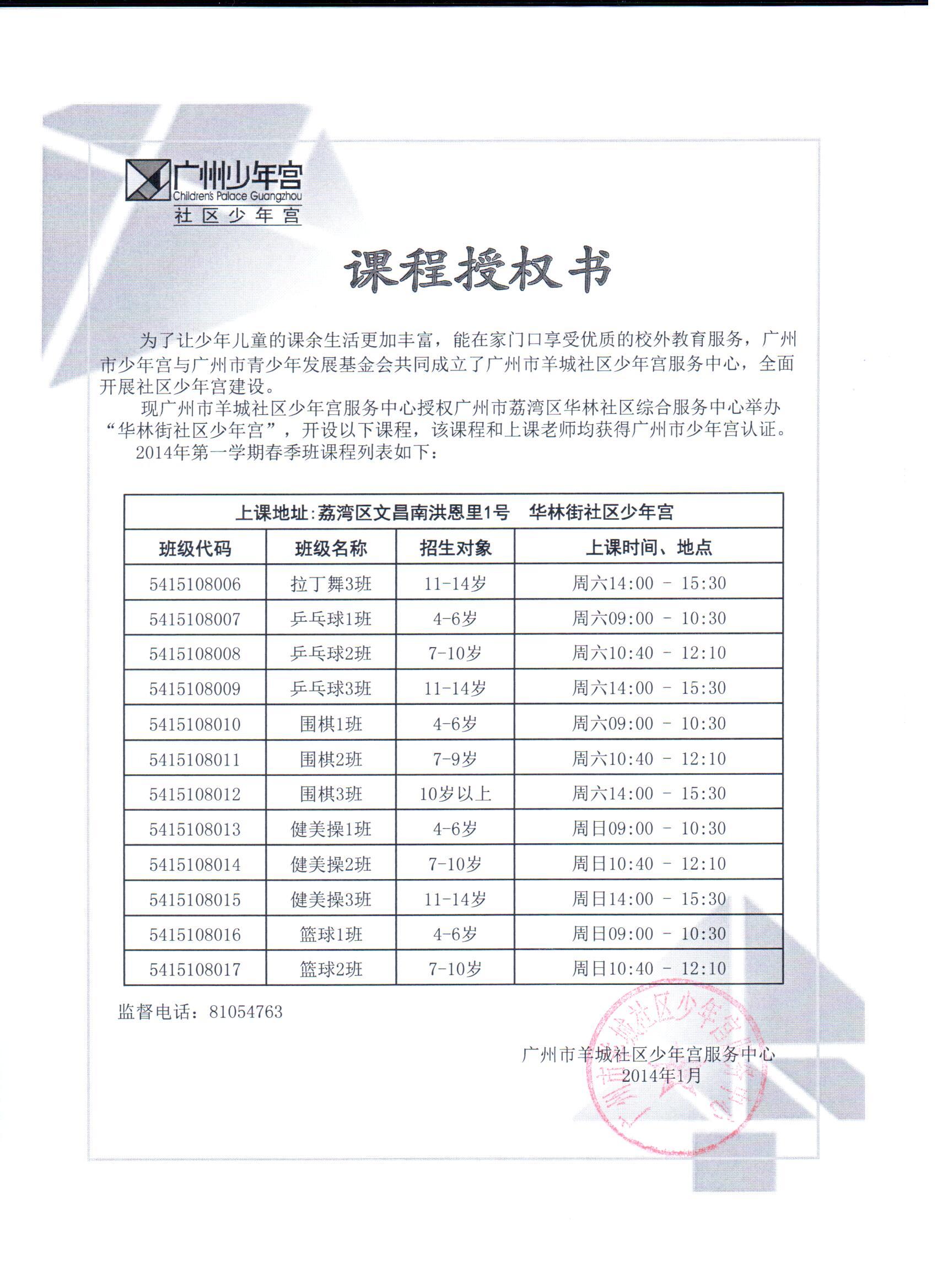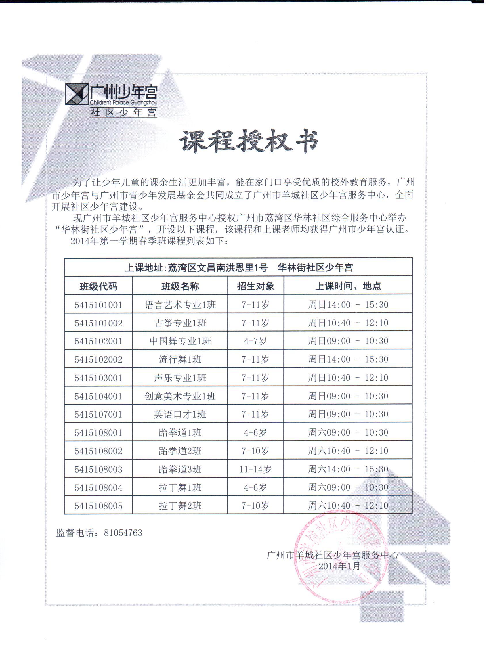 2014年友谊剧院艺术中心社区少年宫课程授权书