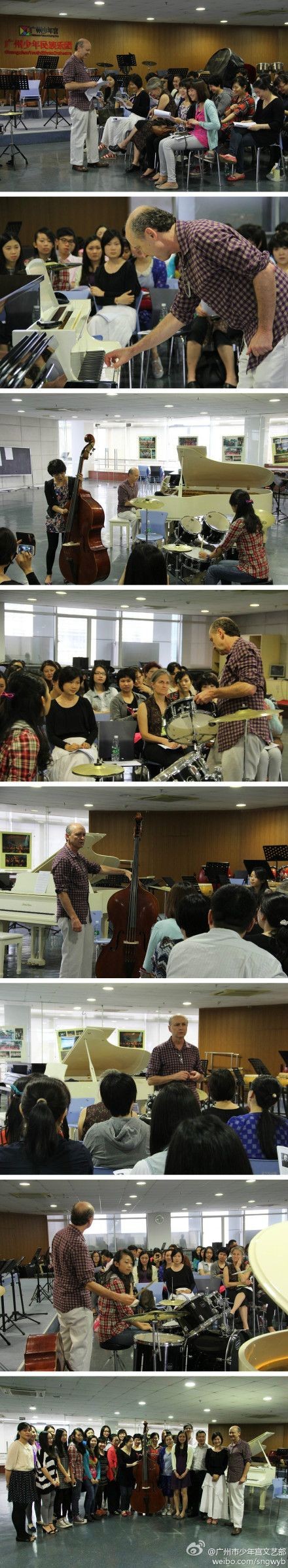 4月24日在广州市少年宫二宫请来美国钢琴家、作曲家Burnett Thompson先生来跟我们的老师作现场交流,现场风趣而且幽默,他介绍了传统和弦和爵士音乐常用的"cool和弦",摇摆节奏,bass伴奏,即兴的一些音形。在他的简单指点下,几个老师用爵士鼓,低音提琴,钢琴即兴合奏起来!太好听了! 20世纪初格什温经典之作《蓝色狂想曲》。边弹边讲解里面的各种风格音型。像他说的,既然做不了严肃音乐家,何不把音乐玩起来,既娱乐又有创造性!何况,严肃的音乐家未必会呢,哈哈!工作坊结束后,老师们都好有冲动练好jazz哦!