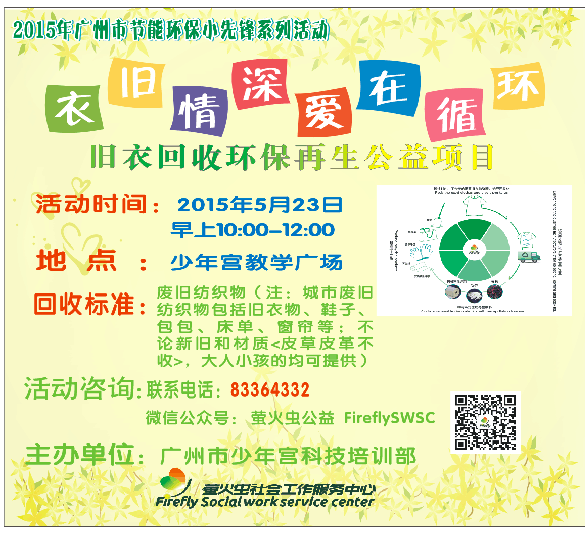 我们呼吁,各位小朋友、老师和家长以实际行动参与5月23日上午10点在广州市少年宫教学广场举行的“衣旧情深 爱在循环”旧衣回收活动,把你的旧衣服(除皮草皮革外)进行环保回收,节约能源、保护环境,从身边小事做起,在举手之劳中一举两得。