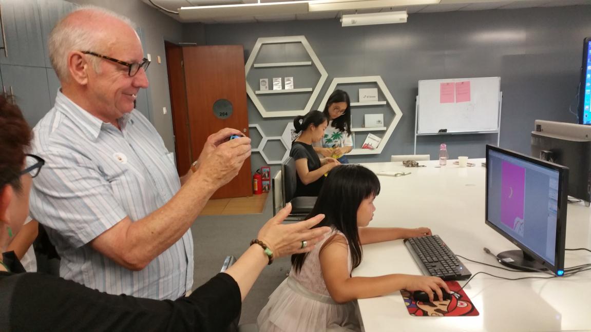 在媒介中心教室,他饶有兴趣地观摩了正在进行的新媒介设计班的课堂,还观看了孩子们自己拍摄制作的微电影。他对广州孩子在新媒介技术的出色表现大加赞赏,还高兴地接受了小学员的作品。