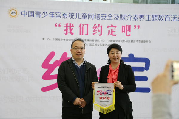 中国青少年宫协会党组成员、副会长朱迎,还向武汉市妇儿活动中心主任曹虹颁授了“我们约定吧”武汉站活动纪念锦旗。